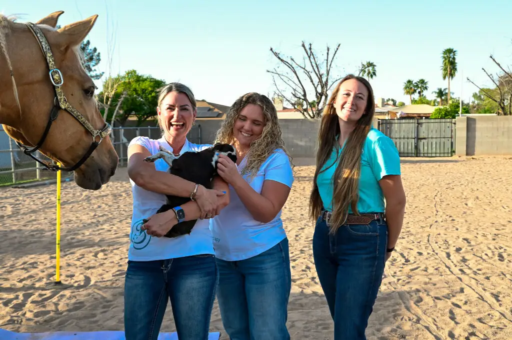 jaqui with two horses in desert landscape
